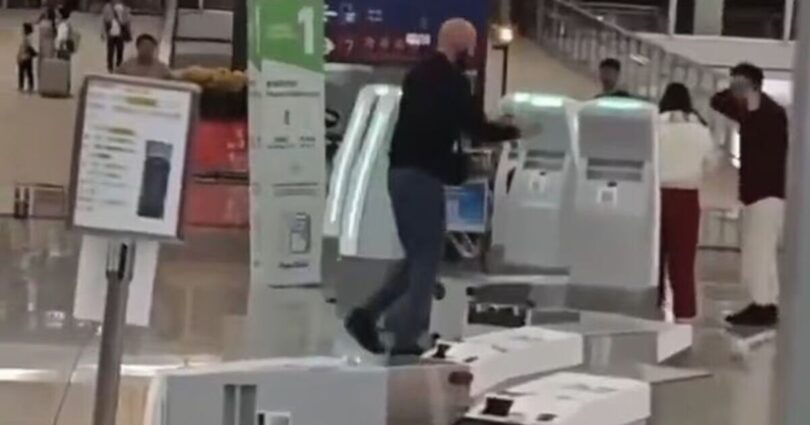 This is the shocking moment a British tourist used a metal post to smash up check-in kiosks, nearby counters and railings during an early morning rampage in Hong Kong Airport. During his rampage, the man, 35, damaged 10 check-in desks at the airport’s Terminal 1 at around 6am local time on Monday (February 16), before being arrested for possessing Viagra.