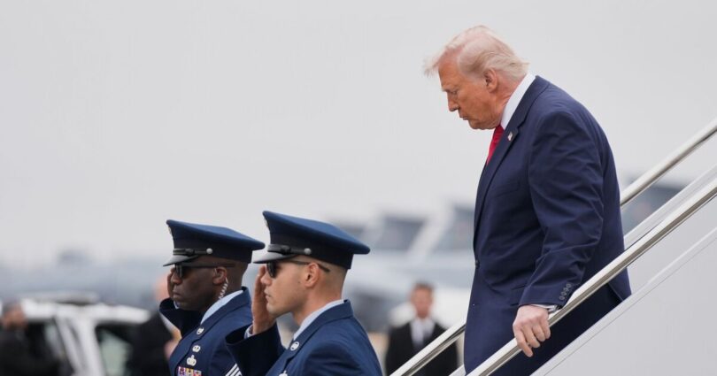 Donald Trump looked ashen-faced as he stepped off Air Force One to welcome home the six US soldiers who were killed in the ongoing conflict with Iran. The US President was pictured arriving at Dover Air Force Base, in Delaware, alongside Defence Secretary Pete Hegseth as the fallen soldiers were prepared to be taken to their final resting place.
