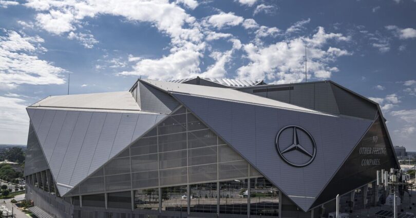 But Atlanta’s Mercedes-Benz Stadium has come to the realisation they could not cover or remove the enormous Mercedes star without causing serious damage. The logo is situated on the roof of the arena and is made up of eight interlocking and moveable panels, each weighing 500 tons and stretching 220 feet long.