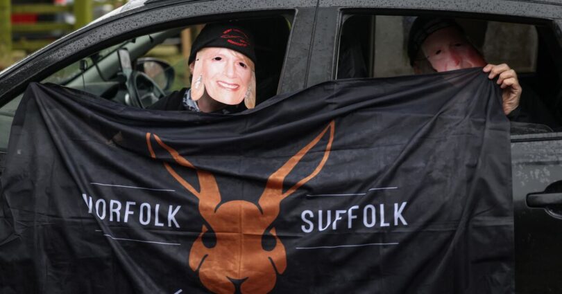 They were seen wearing masks resembling King Charles and Queen Camilla during their demonstration.