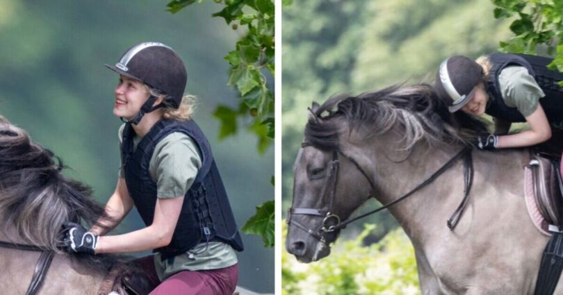 Lady Louise Windsor had to skillfully duck to avoid hitting tree leaves and branches whilst out riding her horse on a hot summer’s day. The daughter of Prince Edward and Duchess Sophie of Edinburgh, was riding in luscious green surroundings but she was kitted out in full protection.