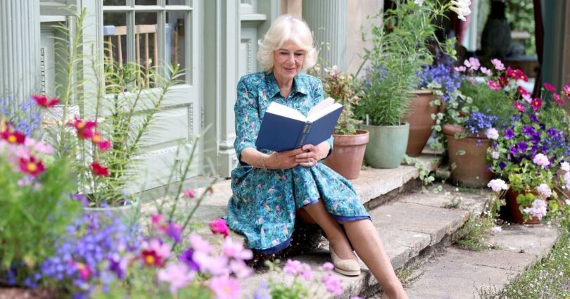 A new picture taken by royal photograph Chris Jackson has been released to mark the five year anniversary of the charity. Taken in July in the garden at Raymill, the Queen’s private house in Wiltshire, Camilla is captured sitting on some steps reading Louise Penny’s The Grey Wolf. Wearing a dark navy floral dress, the Queen smiles sweetly while reading surrounded by floral potted plants.