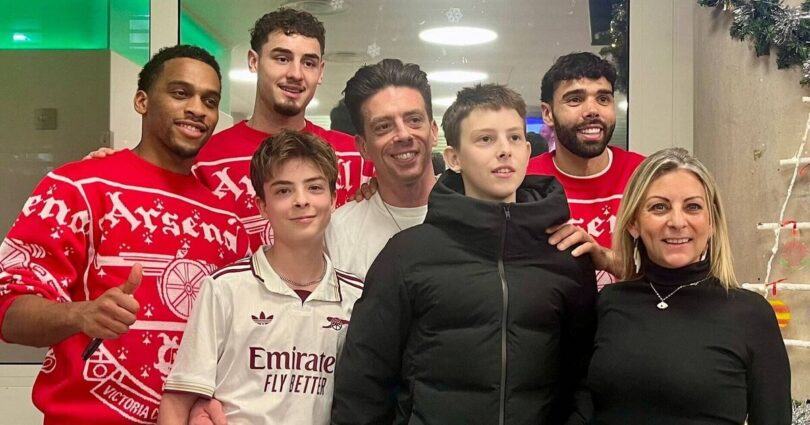 Kit Chester-Canavan with brother Bodie, mum Amanda and Arsenal players Jurrien Timber, Tommy Setford and David Raya (Image: Amanda Chester/SWNS)