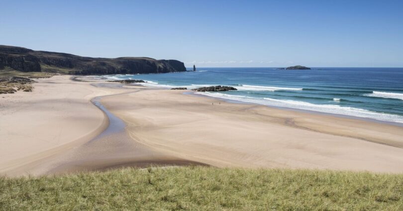 Undiscovered Scotland wrote about the beach: « Sandwood Bay is the most magnificent beach in the UK. It offers nearly a mile and a half of wide pinkish sand backed by huge sand dunes and a loch, and is flanked by cliffs and an impressive sea stack.