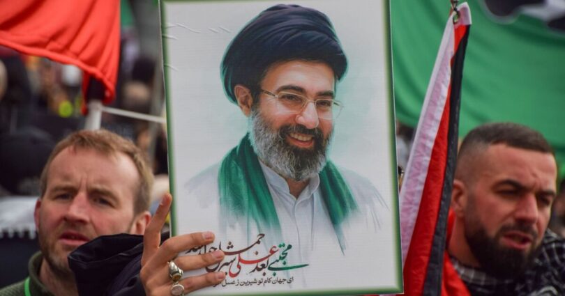 A protester holds up a picture of Mojtaba Khamenei during pro Ayatollah rally London (Image: Getty)