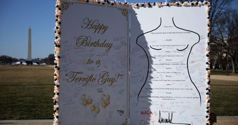 A 10-foot replica of a sexually suggestive message Donald Trump is said to have written to Jeffrey Epstein has appeared on the National Mall in Washington DC. The installation, which coincided with what would have been the disgraced financier’s 73rd birthday on January 20, featured a drawing of a woman’s torso and what appeared to be the US President’s signature. The reproduction, based on a birthday note bearing Mr Trump’s name that was released among a tranche of documents in Epstein’s possession last year, concluded with the cryptic line: « Happy Birthday – and may every day be another wonderful secret. »
