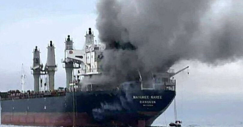 A ship on fire in the Strait of Hormuz after being hit by a projectile (Image: Getty)