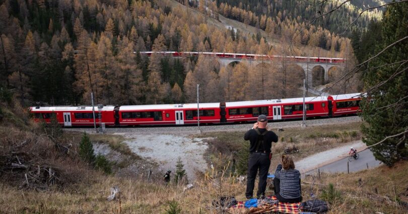 The route winds through 22 tunnels, several of which spiral through the mountainside, and 48 bridges, including the curved Landwasser Viaduct. Onlookers gathered throughout the valley to witness the extraordinary train’s passage.