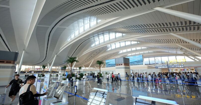The terminal’s sweeping roofline is inspired by the nearby Kunyu Mountains, while wave-shaped ceilings and abundant skylights evoke the region’s unique coastal scenery. Inside, landscaped atriums, open spaces, and natural light create a calm and welcoming atmosphere for passengers.