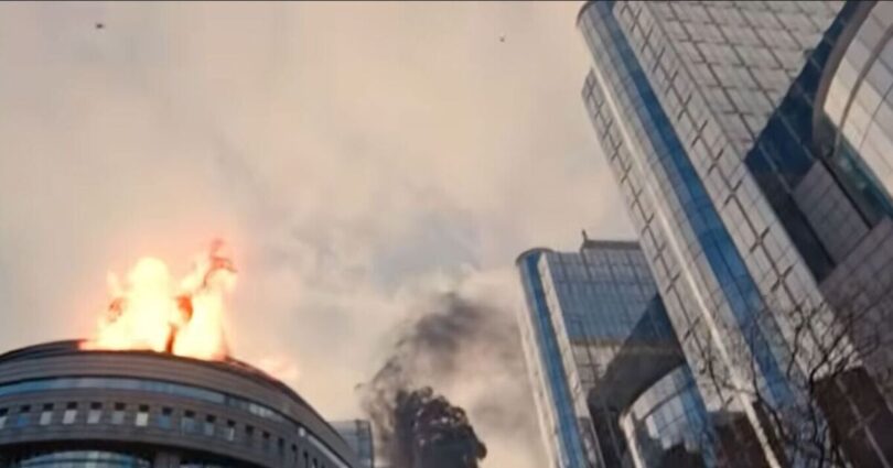 The video then depicts drones striking targets in Davos and Brussels. In the Belgian capital, one of the targets hit multiple times is the European Parliament building.